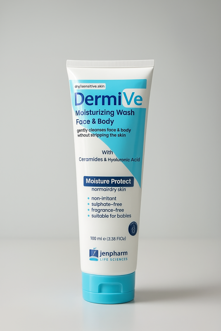 DermiV’e Moisturizing Wash is a gentle, non-irritant face and body cleanser specially formulated for dry and sensitive skin. Enriched with Ceramides and Hyaluronic Acid, it restores the skin’s natural barrier, locks in long-lasting moisture, and cleanses without stripping essential hydration. Free from sulphates, parabens, and fragrances, this dermatologist-recommended wash is safe for everyday use — even for babies and those with delicate skin. Leaves your skin feeling fresh, nourished, and comfortably soft after every wash.