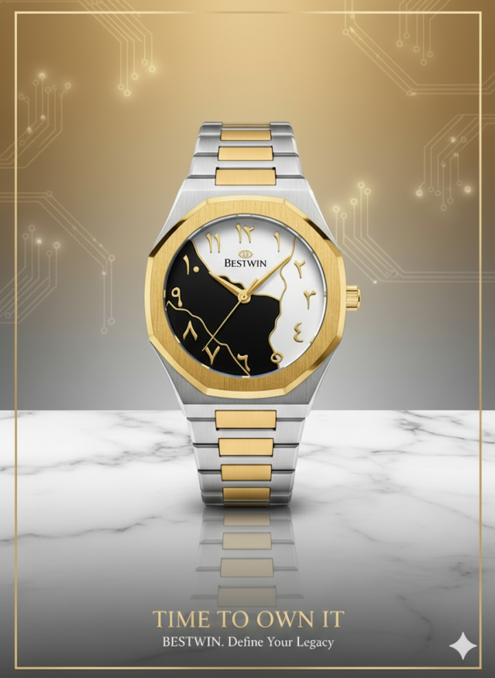 Experience refined luxury with the BESTWIN Opulence Timepiece. This watch features a stunning gold-tone finish and a captivating, patterned emerald green dial that is designed to capture attention.